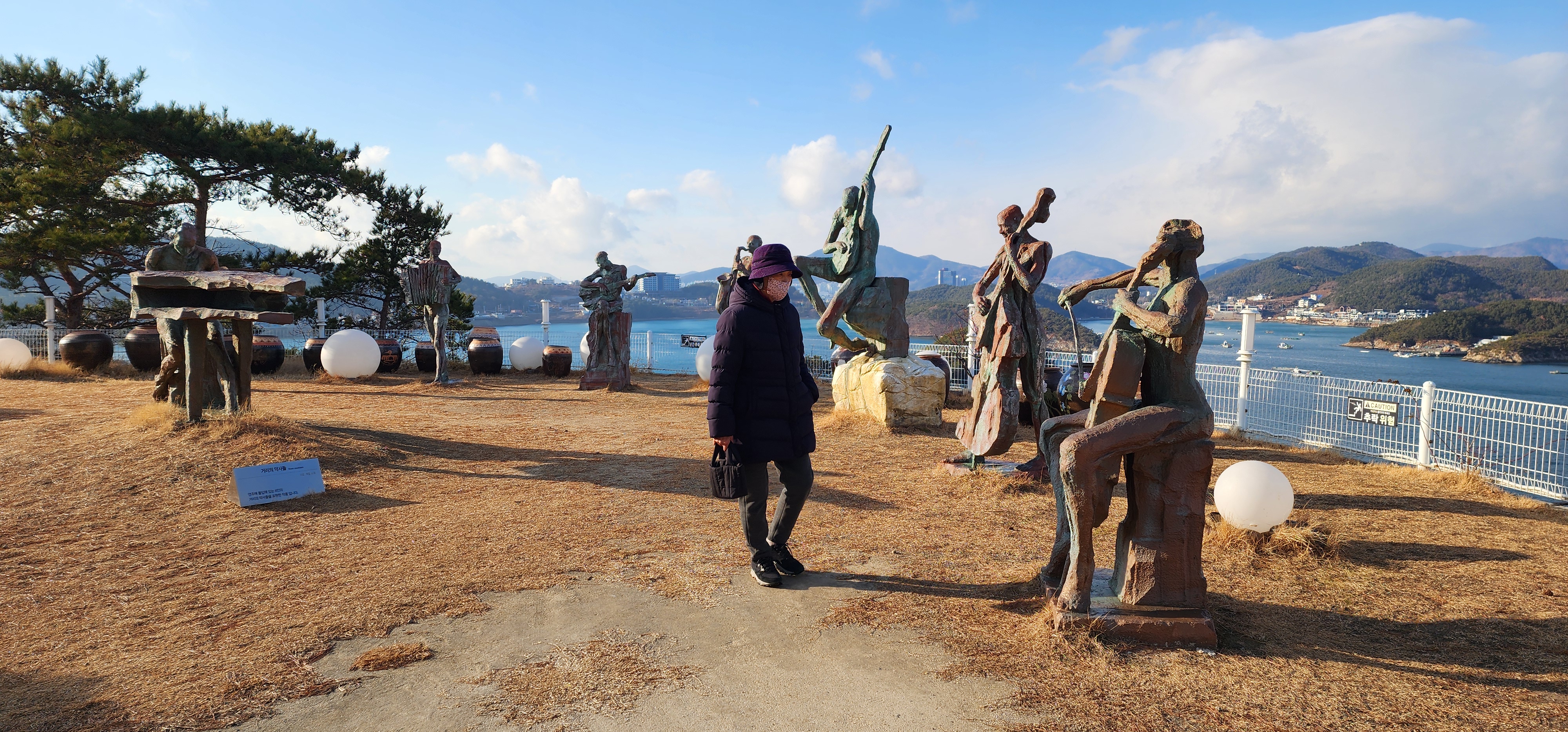 입구의 미디어 아트 길을 지나면 야외 조각공원이 나오는데 돈을 많이 들인 표시가 난다. 그 옛날 만지는 것마다 황금으로 변했다는 미더스의 손을 형상화한 조각, 마이다스의 손이 있다. 이곳에 올라가서 사진을 찍으려면 번호표를 받아 기다려야 한다. 다행히 오늘은 날도 춥고 눈보라가 쳐서 바로 올라가 보았다.